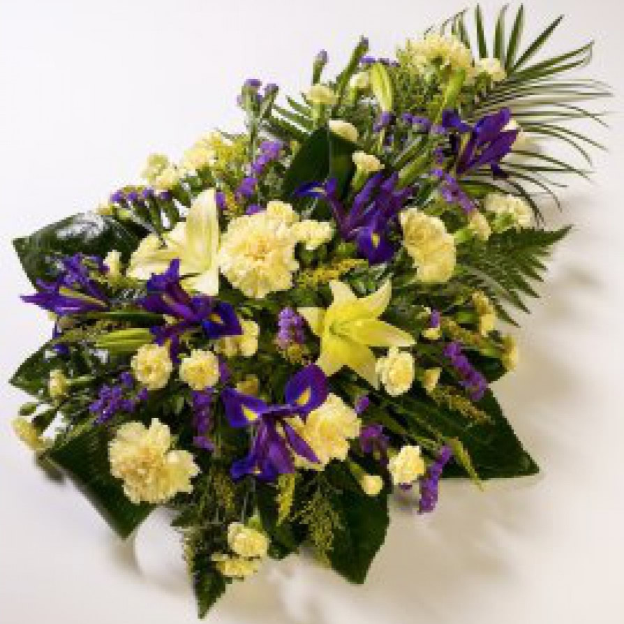 Lilies and Carnations are presented with Irises, Spray Carnations and luxury foliage to create this lemon and blue teardrop spray.